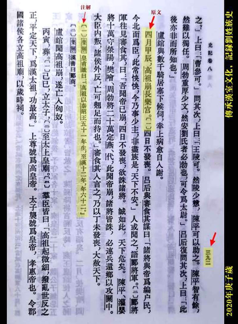 2、《史记·卷八·高祖本纪·第八》中华书局1959年9月繁体竖版,第三九二页(见上图)中记载说:“四月甲辰,高祖崩长乐宫。[一]”此正文说明的是汉高祖十二年四月汉高祖刘邦驾崩于长乐宫,是年为公元前195年乙巳岁。