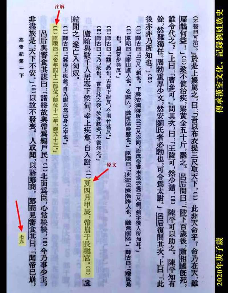 《汉书·卷一下·高帝纪·第一下》,中华书局1962年6月繁体竖版,第七九页(上图)中记载说:“夏四月甲辰,帝崩于长乐宫。[二]”,此即系说刘邦驾崩于汉高祖十二年夏四月甲辰日,农历为丙午岁四月廿五日,公历为公元前195年6月1日,此时间是准确的。