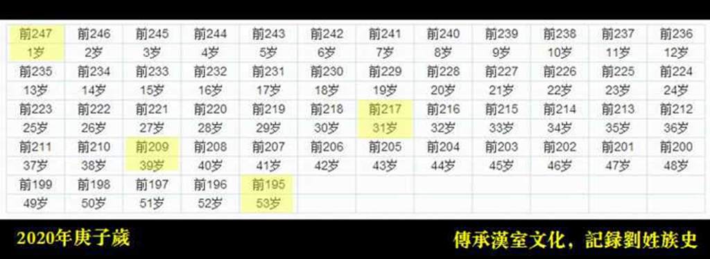 第二种 享年53岁说:以汉高祖刘邦降生于魏安厘王三十年.秦庄襄王三年甲寅岁(公元前247年),驾崩于丁汉高祖十二年丙午岁(公元前195年),享年53岁,在此简称“享年53岁说”。 与第一种相比是少了九年,即系秦皇赢政十三岁时刘邦公才出生的。