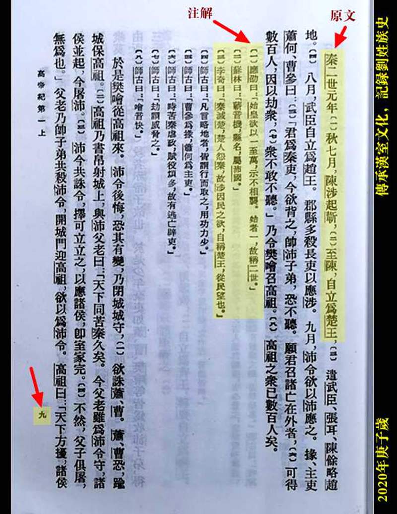 1、《史记·卷八·高祖本纪·第八》中华书局1959年9月繁体竖版,第三四九页(上图)中记载说:“秦二世元年[一]秋,陈胜等起蕲,[二]至陈而王,号为‘张楚’。”文中只说明秦二世元年秋天陈胜、吴广的农民起义暴发于沛属的蕲地,打至陈地称王,号为张楚也。查《中国古代万年历》得知是年为公元前209年壬辰岁也。