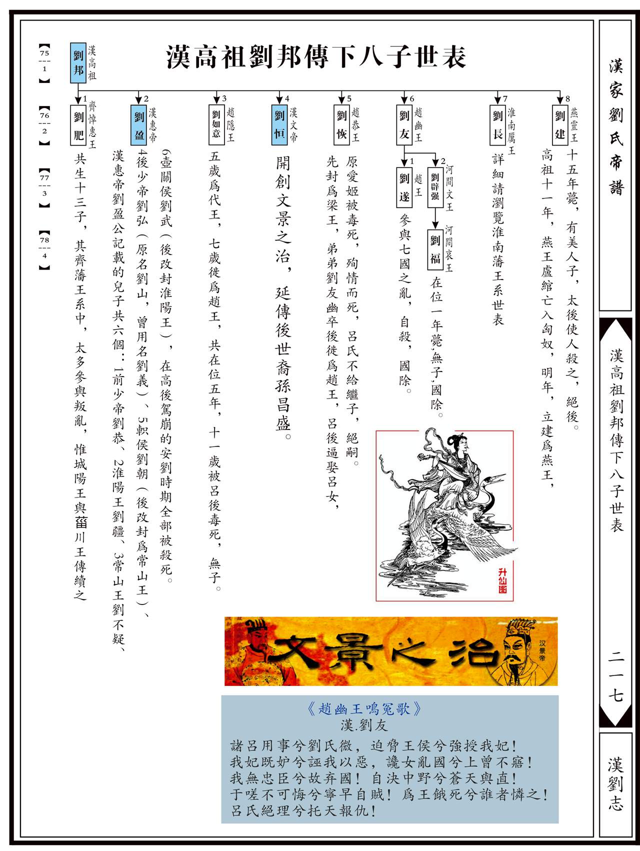 汉高祖刘邦公共生八子,其中有五子均亡后,只得庶长子刘肥、四子刘恒和七子刘长共三子传下,故以下详述此三房的后裔。 |