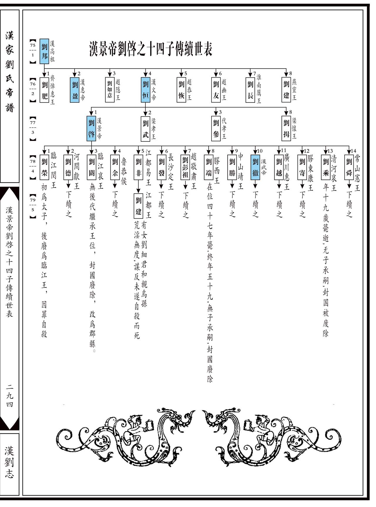 其直系传递世系为:75汉高祖邦公→76汉文帝恒公→77汉景帝刘启→78汉都易王刘非→79江都王刘建,第二代国王刘建荒淫无度,最后企图谋反未遂自杀而死,他有个女儿叫刘细君,即历史上著名的江都公主或乌孙公主。她是被史学家们将芳名载入史册的第一位汉家和亲公主,也是“和亲”获得成功的第一人。