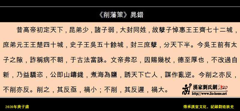 晁错在《削藩策》“高祖刚平定天下时,因兄弟小,几个儿子尚年幼,同姓的很多人被封为诸侯王,齐国辖七十余城,楚国四十余城,吴国甄十余城,这三个诸侯国几乎占去了天下一半的疆土。吴王劉濞以前因皇太子劉启杀了他的儿子而与朝廷结怨,托病不来朝见,依法应杀,只因文帝仁慈,不忍处罚他,反赐杖给他,允许他不再朝觐。朝廷对他有如此之厚的恩德,吴王本应改过自新才是:但他反而更加骄横,在国内铸钱煮盐,招引天下的罪人阴谋作乱,现在削他的地他会反,不削也要反。削地他反得快,祸害要小些;不削地反得慢一些,祸更大。”