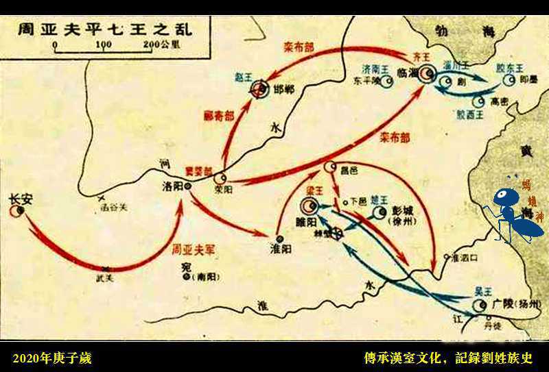 汉景帝劉启记得,在父亲汉文帝劉恒驾崩前的训戒:“即有缓急,周亚夫真可任将兵。”,故在七国反叛确认书至,乃拜中尉周亚夫为太尉,将三十六将军往击吴、楚联军,派曲周侯郦寄率领一支队伍击赵王劉遂,派将军栾布率领一支队伍入齐,平定齐地,复召窦婴,拜为大将军,使屯兵荥阳,监视战局。