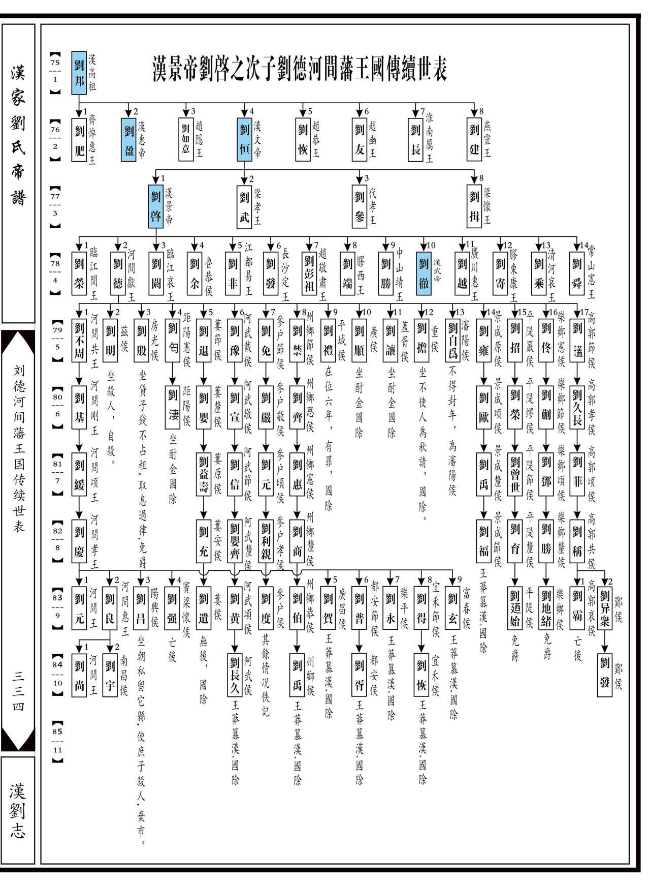 上代祖源:1源明公……18累公……72刘清→73刘荣→74太上皇煓刘执嘉→75(1)汉高祖刘邦→76(2)汉文帝刘恒→77(3)景帝刘启→78(4)河间献王刘德……