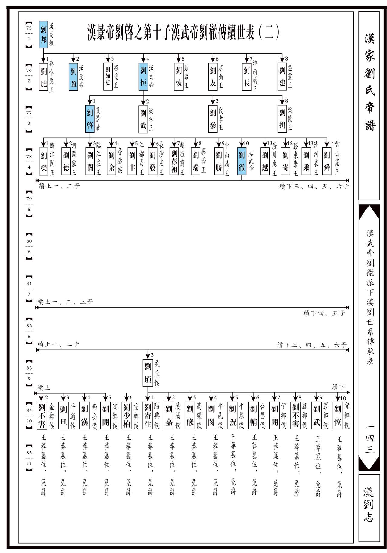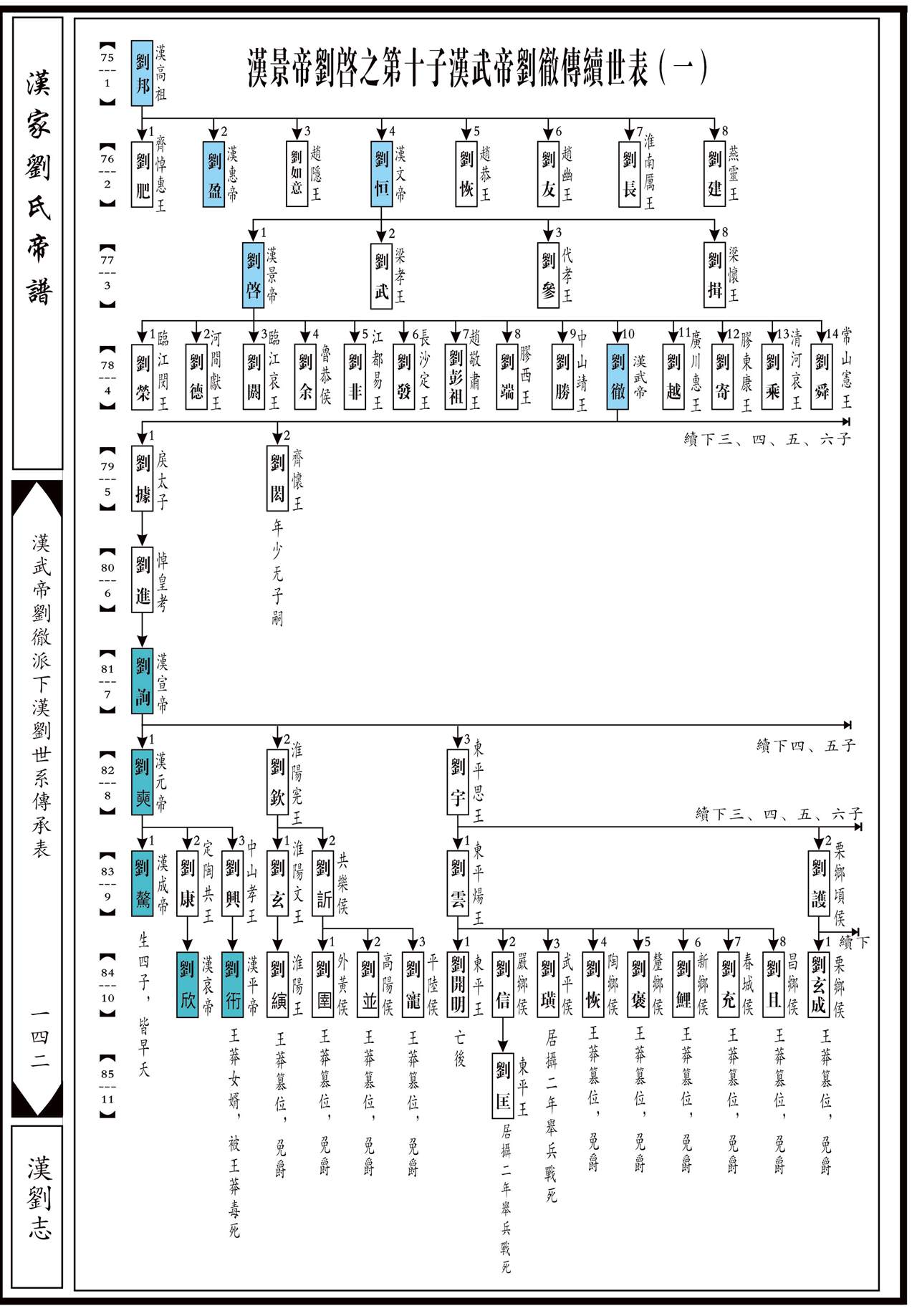 上代祖源:1源明公……18累公……72刘清→73刘荣→74太上皇煓刘执嘉→75(1)汉高祖刘邦→76(2)汉文帝刘恒→77(3)汉景帝刘启→78(4)汉武帝刘彻……