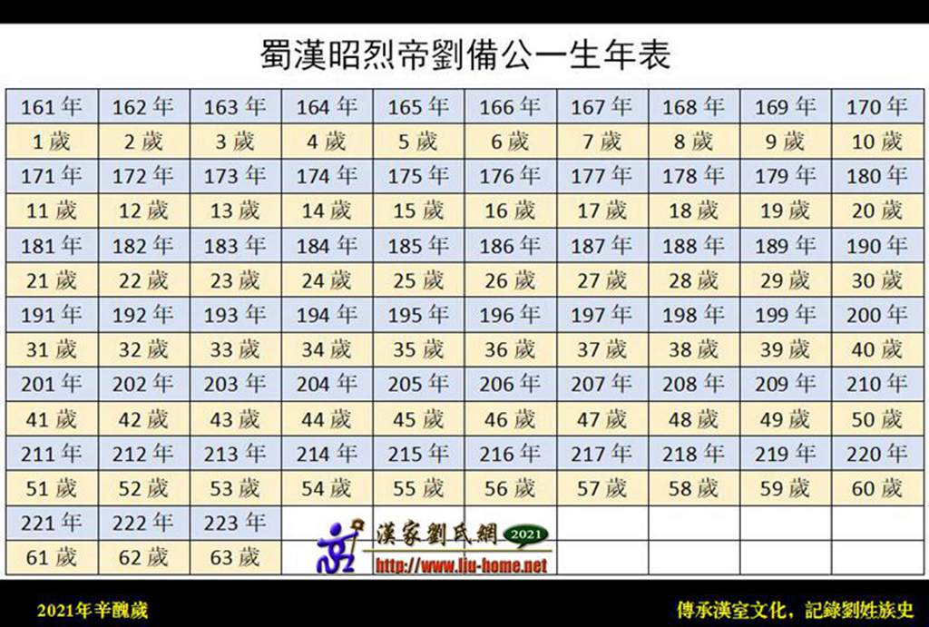 《三国志·先主传》中无刘备生年,仅说他薨于章武三年(223年),时年六十三。先人计算年龄都算虚岁,照此逆推,刘备当生于汉桓帝延熹四年(161年)。因此,刘备的生卒年代应是161年~223年。