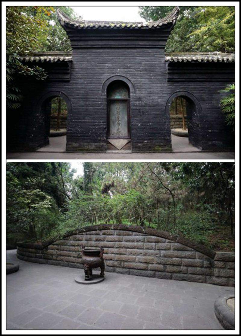 汉惠陵,史称“惠陵”,位于四川省成都市南郊武侯祠内之正殿西侧。史载,章武三年四月,刘备驾崩于白帝城永安宫(在今重庆奉节县城),五月梓宫还成都,八月葬惠陵。后主从诸葛亮之意,先后将甘、吴两位夫人合葬于此。坟墓拔地而起,呈圆堆形,占地2000平方米,高12米,周长180米,占地3亩,形若小丘。陵前有“汉昭烈皇帝之陵”碑,清乾隆五十三年(1788年)立。茔上树木参差,墓边古柏森森。陵墓建筑,由照壁、栅栏门、神道、寝殿等组成。照壁长10米,高5米,正中镶嵌菱形石雕。刘备墓现有匾“汉昭烈陵”“千秋凛然",对联: