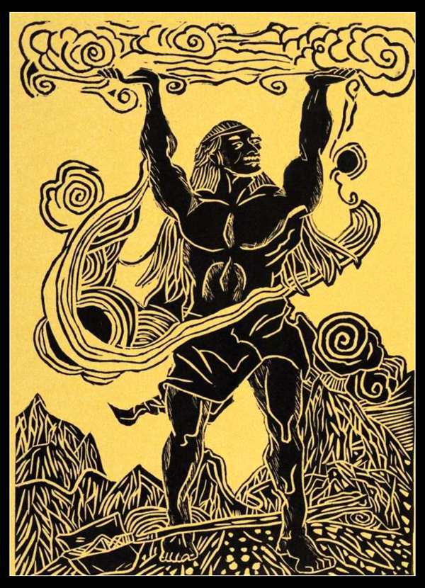 天气蒙鸿,萌芽兹始,遂分天地,肇立乾坤,启阴感阳,分布元气,乃孕中和,是为人也。首生盘古。垂死化身。气成风云。声为雷霆。左眼为日。右眼为月。四肢五体为四极五岳。血液为江河。筋脉为地里。肌肉为田土。发为星辰。皮肤为草木。齿骨为金石。精髓为珠玉。汗流为雨泽。身之诸虫。因风所感。化为黎甿。”