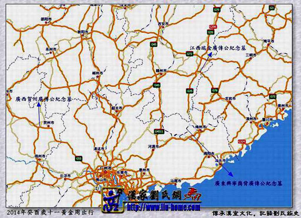 故我客家刘氏东江派系二世祖广传公原坟墓已经毁没,现存的坟墓纪念地有: