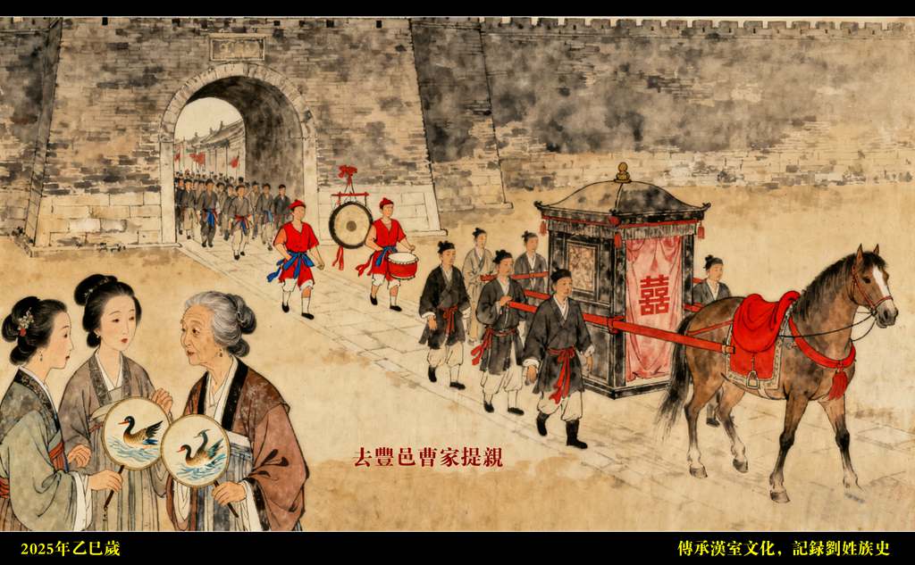 喜乐声越吹越欢,调子愈发高昂,唢呐声拔尖处直冲云霄,沿途的街坊邻居都扒着门框或院墙往外瞧,脑袋凑成一团团,交头接耳间眼神里满是好奇与笑意。有相熟的大婶拔高了嗓门喊,声音穿透乐声:“刘太公,这是领着咱刘季上曹家娶媳妇去啦?可得好好办席,让咱都沾沾喜气啊!”父亲笑着拱手连连应承,手臂挥动带起宽大的袖口,声音里都带着笑意:“一定一定!到时候都来热闹热闹!”