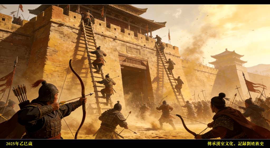 义军清晨抵达城下,只见秦军严阵以待,旗帜鲜明,守备森严。刘邦观察局势,见对方态度强硬,防线稳固,遂当机立断改变策略。他深知强攻必损兵折将,于是命令樊哙率领一部兵力在城南展开佯攻,士兵们搭设云梯、擂鼓呐喊,故作全力攻城之势,以吸引秦军主力注意力;与此同时,刘邦自己则与曹参精选千余精锐士卒,利用地形掩护,悄悄绕至城北。此处城垣因靠近沼泽地带,常年受水汽侵蚀,墙体潮湿斑驳,相对低矮且结构松动,秦军多认为义军不会从此处冒险进攻,因此防守较为薄弱,仅有零星哨兵巡逻。刘邦趁夜色朦胧,下令士卒悄无声息地准备突袭,以期一举破城。