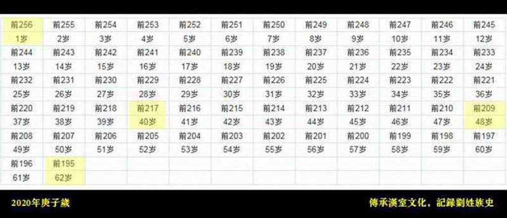 第二种 享年53岁说:以汉高祖刘邦降生于魏安厘王三十年.秦庄襄王三年甲寅岁(公元前247年),驾崩于丁汉高祖十二年丙午岁(公元前195年),享年53岁,在此简称“享年53岁说”。 与第一种相比是少了九年,即系秦皇赢政十三岁时刘邦公才出生的。