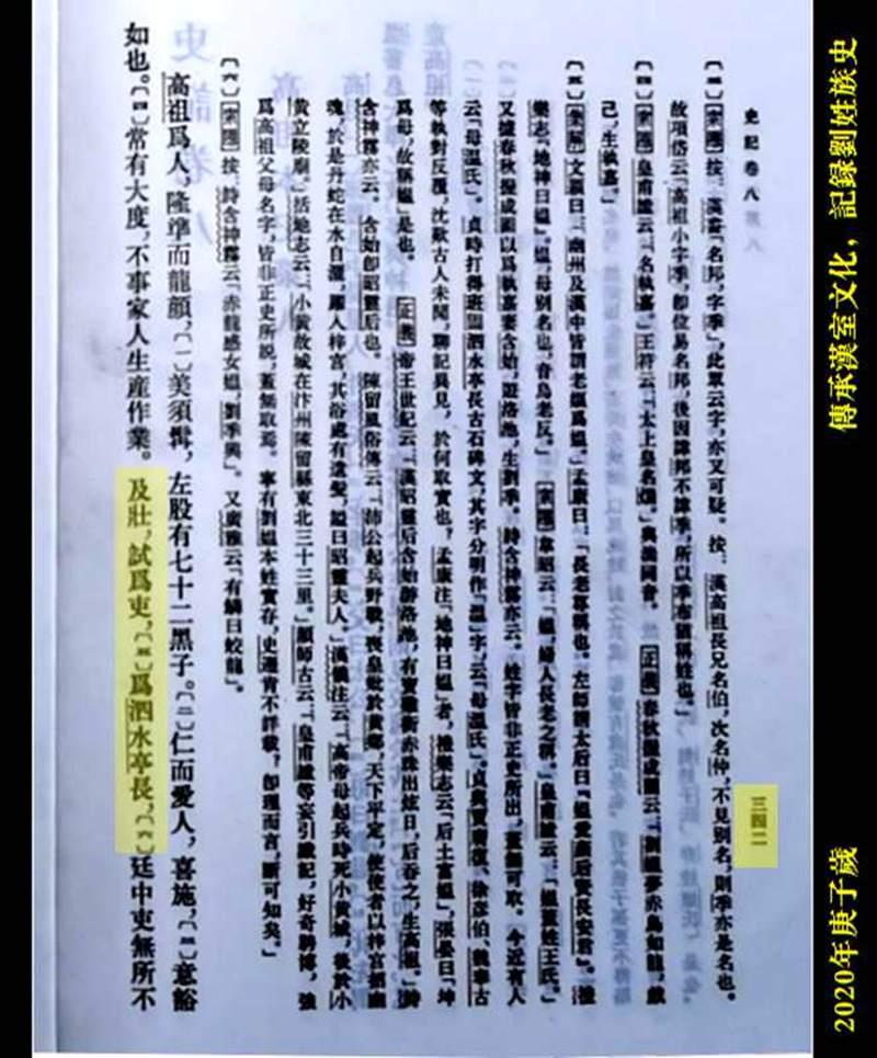 《史记·卷八·高祖本纪·第八》中华书局1959年9月繁体竖排版,第三四二页中记载曰: “高祖为人,隆准而龙颜,美须髯,左股有七十二黑子。仁而爱人,喜施,意豁如也。常有大度,不事家人生产作业。及壮,试为吏,为泗水亭长,廷中吏无所不狎侮。……”