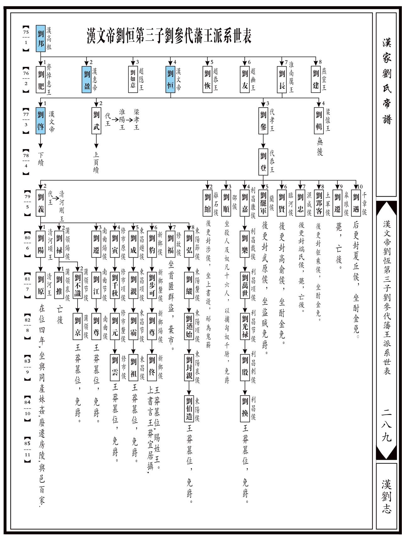 祖系刘氏第七十八世祖,代孝王刘参之子,汉文帝后元三年庚辰岁(公元前161年)嗣父位为代王,在位二十九年薨,谥为代恭王。妣佚记,共生十子: 1义(代王→清河刚王)、2绾(离石侯-涉侯)、3顺(邵侯)、4嘉(利昌康侯)、5罢军(蔺侯-武原侯)、6贤(临河侯-高俞侯)、7忠(湿成侯-端氏侯)、8郢客(土军侯-钜乘侯)、9迁(皋琅侯)、10遇(千章侯-夏丘侯)。