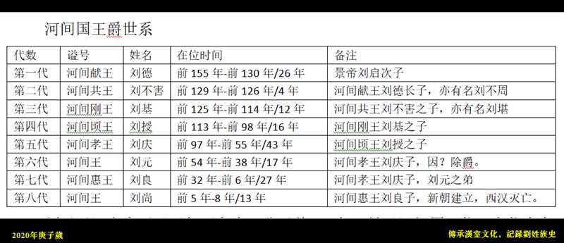 河间献王刘德生十二子:1刘不害(河间共王)、2刘明(兹侯)、3刘殷(旁光侯)、4刘匄(距阳宪侯)、5刘退(蒌节侯)、6刘豫(阿武戴侯)、7刘免(参户节侯)、8刘禁(州郷节侯)、9刘礼(平城侯)、10刘顺(广侯)、11刘让(盖胥侯)、12刘摇(千钟侯,汉书为重侯刘担)。