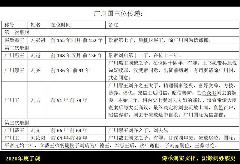 泗水王位传递次序为:1泗水思王刘商→2泗水哀王刘安世→3泗水戴王刘贺→4泗水勤王刘综→5泗水戾王刘骏→6泗水王刘靖。