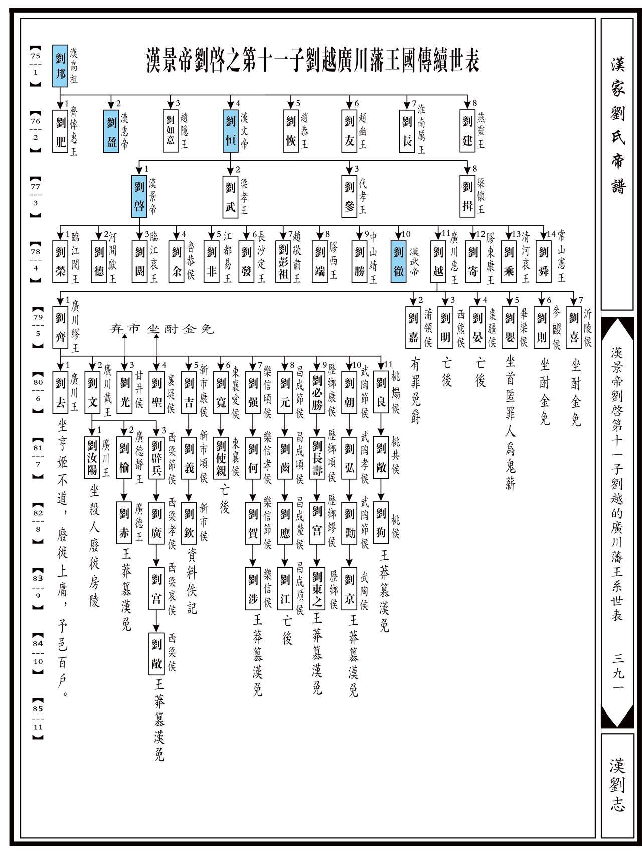上代祖源:1源明公……18累公……72刘清→73刘荣→74太上皇煓刘执嘉→75(1)汉高祖刘邦→76(2)汉文帝刘恒→77(3)景帝刘启→78(4)广川惠王刘越......