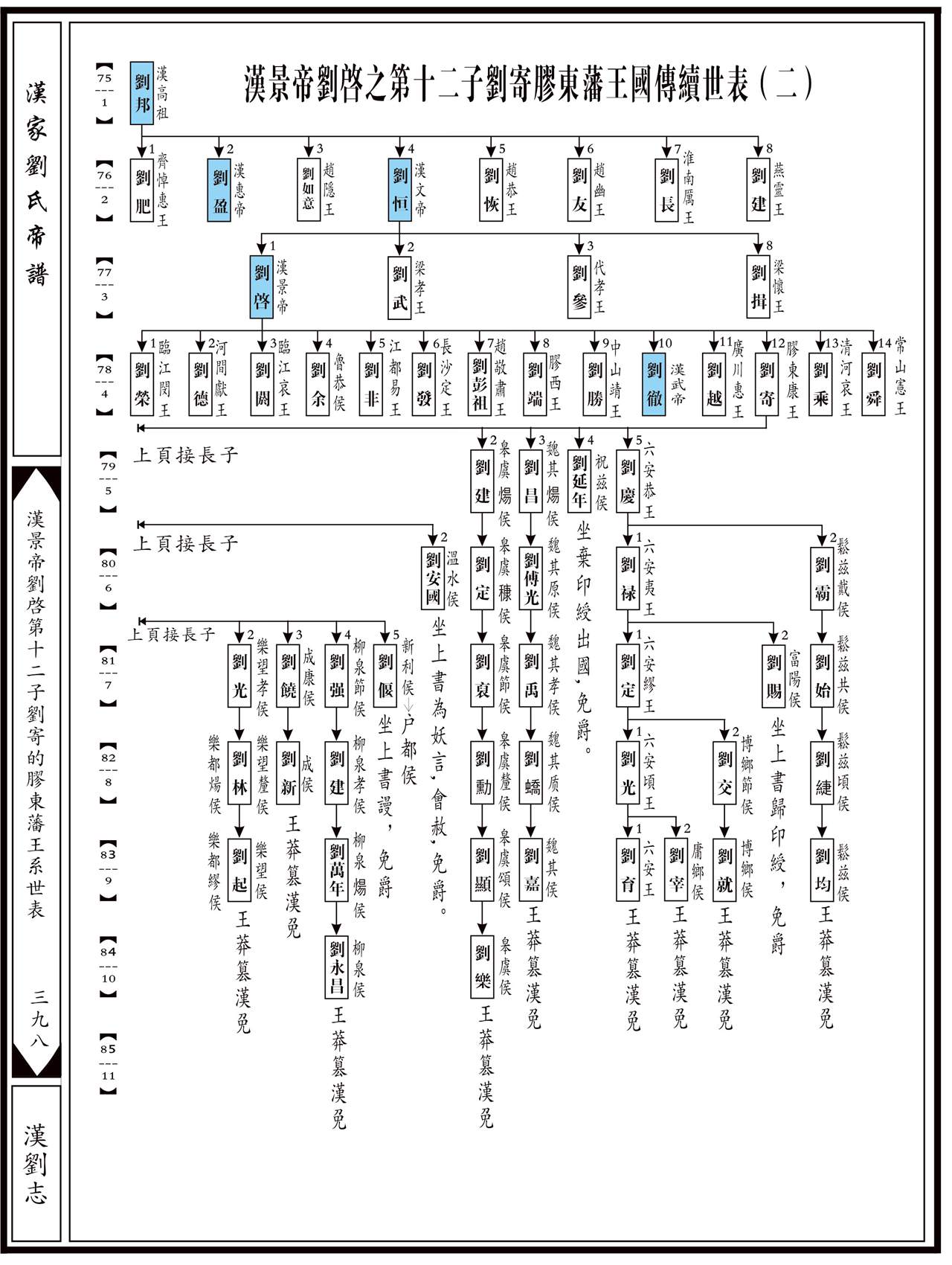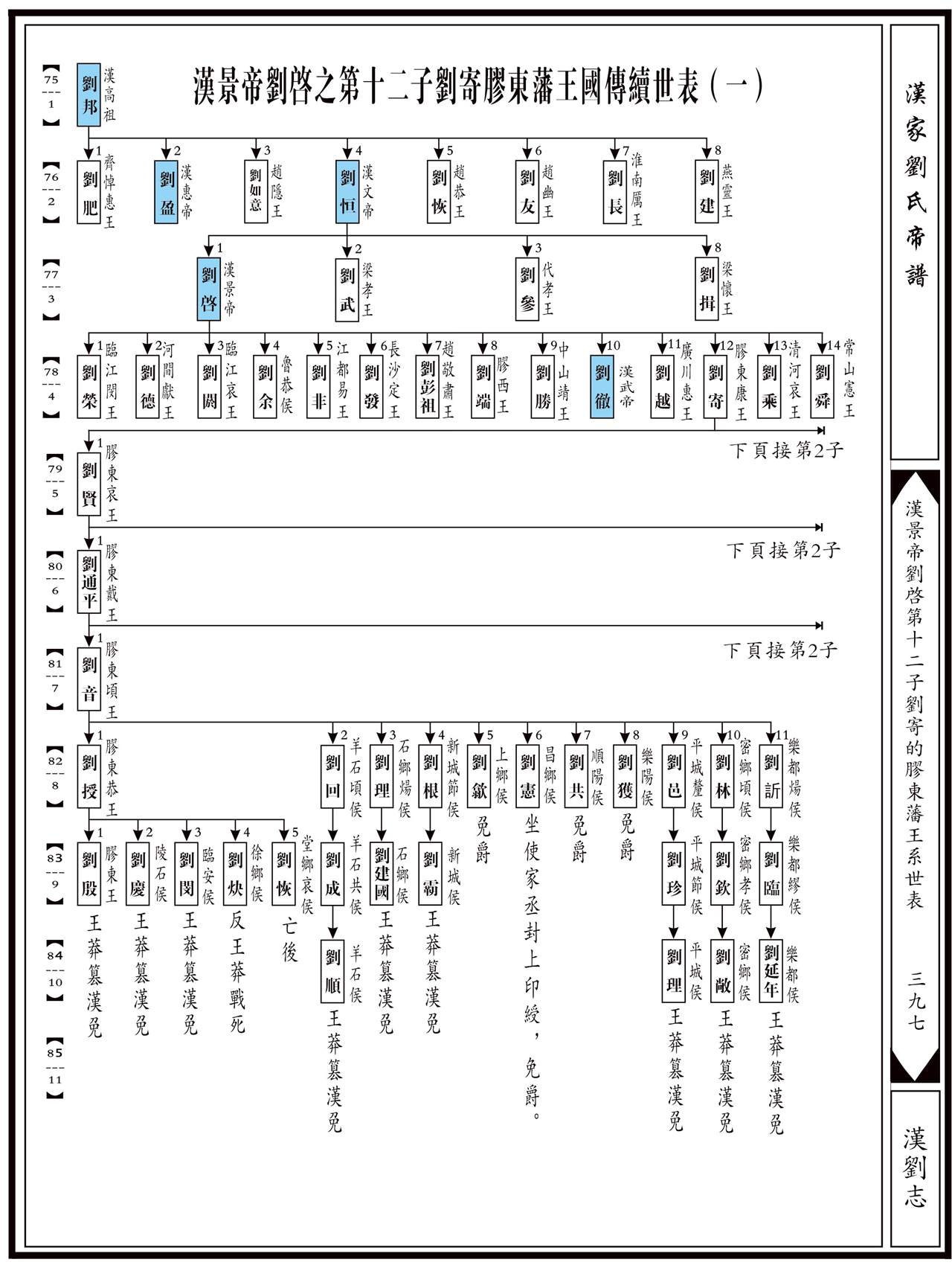 上代祖源:1源明公……18累公……72刘清→73刘荣→74太上皇煓刘执嘉→75(1)汉高祖刘邦→76(2)汉文帝刘恒→77(3)景帝刘启→78(4)胶东康王刘寄......