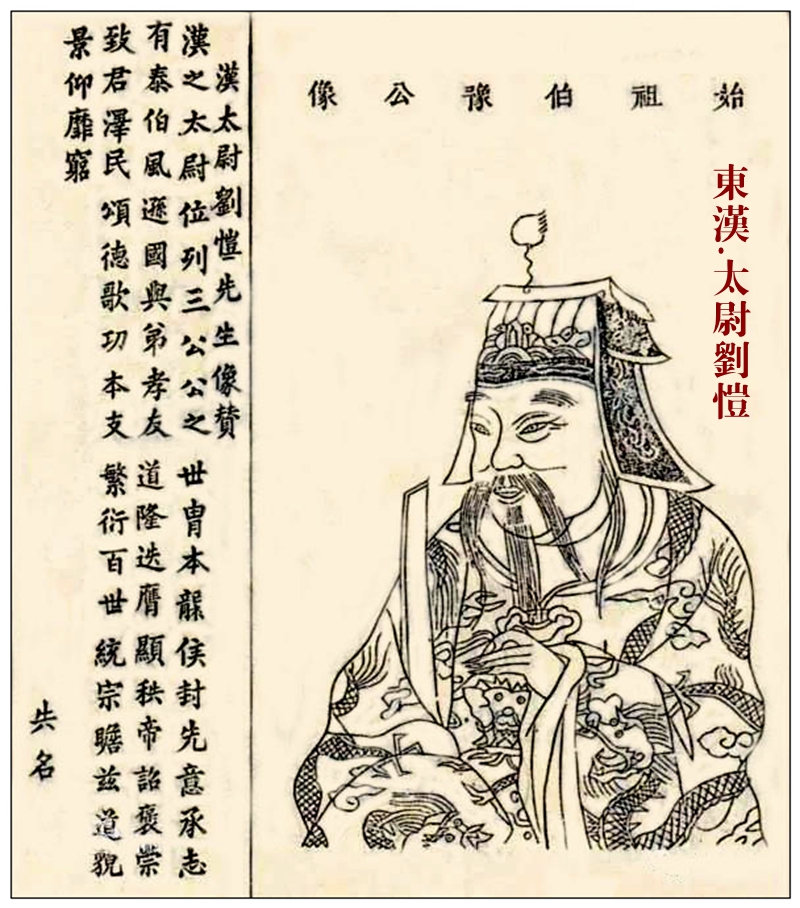 祖系刘氏第八十六世祖,居巢侯刘般长子,字伯豫,辞别承续居巢侯爵,让与弟刘宪。汉和帝拜为郎,后官至太尉。生子:茂。