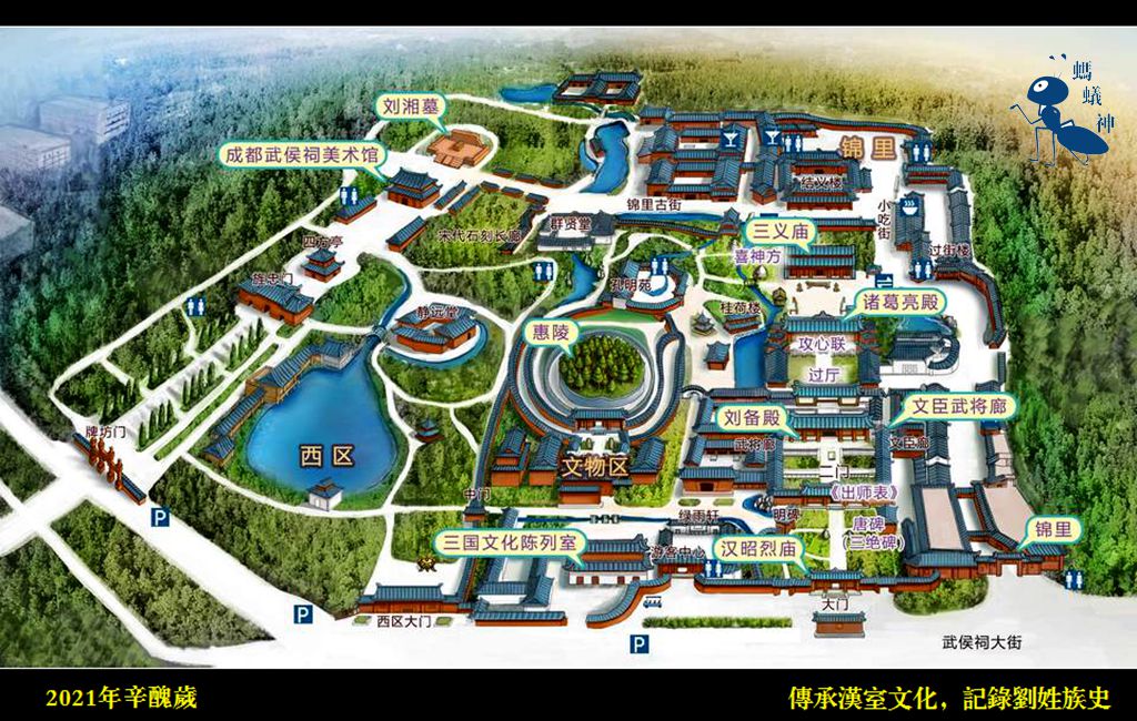 汉惠陵,史称“惠陵”,位于四川省成都市南郊武侯祠内之正殿西侧。史载,章武三年四月,刘备驾崩于白帝城永安宫(在今重庆奉节县城),五月梓宫还成都,八月葬惠陵。后主从诸葛亮之意,先后将甘、吴两位夫人合葬于此。坟墓拔地而起,呈圆堆形,占地2000平方米,高12米,周长180米,占地3亩,形若小丘。陵前有“汉昭烈皇帝之陵”碑,清乾隆五十三年(1788年)立。茔上树木参差,墓边古柏森森。陵墓建筑,由照壁、栅栏门、神道、寝殿等组成。照壁长10米,高5米,正中镶嵌菱形石雕。刘备墓现有匾“汉昭烈陵”“千秋凛然",对联: