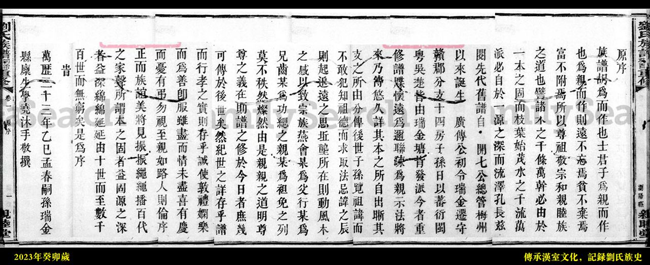 以下为收录于湖南浏阳1873年版《刘氏族谱》中的原序文,署名为:明万历三十三年乙巳(1605)孟春嗣孙瑞金县廪生学尧沐手敬撰序,应该是刘学尧在明朝万历年间重修族谱了的,但未见原谱。序文如下: