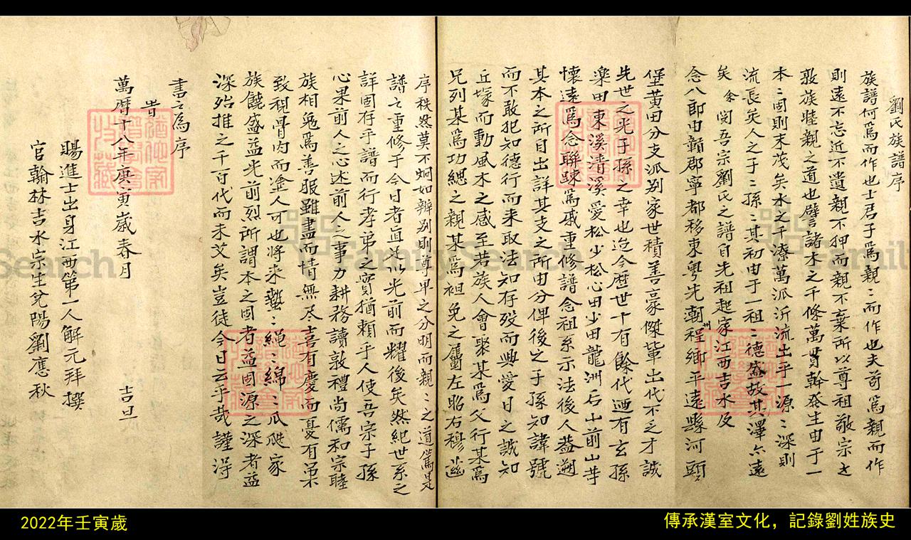【20221029汉家刘爱民注】:恭读此序文,可知刘应秋的吉水家族为平远念八郎公之派衍,而序文中亦说清楚吉水老家的族人修谱,请当时任职南京国子监司业的刘应秋撰写序文,时间在明朝万历十八年,即系公元1590年,是刘应秋入仕的第七、八个年头,他根本是不可能参与修谱的,故与序文是对得上的。