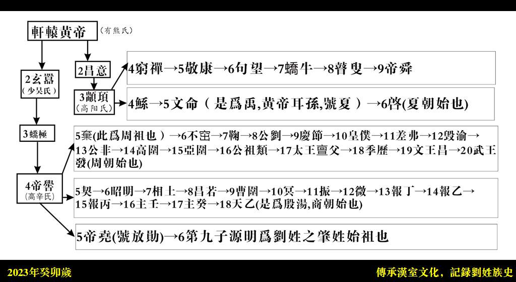 远古祖系:包含人类始祖,盘古氏开天辟地,然后三皇治世,再历五帝至舜帝矣。而刘姓创始为帝尧第九子源明公创姓。