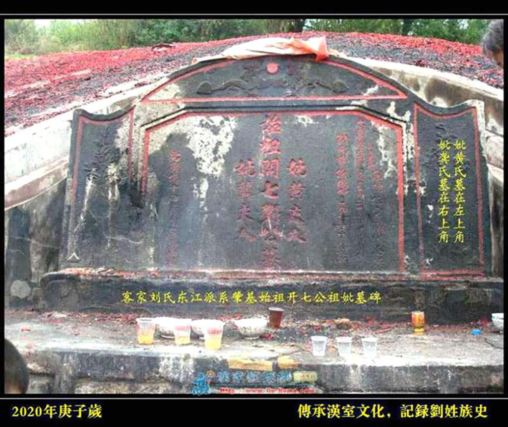 开七公原住福建宁化石壁洞,后迁居宁化城里,官授潮州都统制(总镇),即在潮州程乡立业。公率兵往兴宁岗背平乱卒于行营,葬于兴宁岗背黄蜂蟑下高车头,行山象形鼻穴,座向为巽山干向。两位夫人则合葬于左右眼穴,黄氏在左眼穴,龚氏为右眼穴,陪待左右,夫唱妇随,呈现和谐佳景。