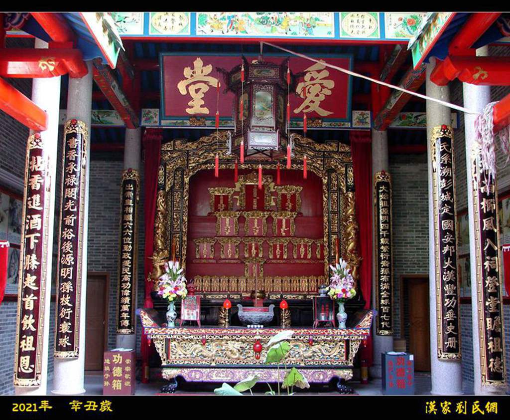 上厅设“爱敬堂”供奉历代始祖的灵位牌,主祀血源圣祖尧帝、太始祖源明公、累公、邦公、秀公、备公、祺公、祥公、禋公、龙公、开基祖开七公,二世祖广传公,三世祖巨源、巨湶、巨汌、巨渊、巨海、巨浪、巨波、巨涟、巨江、巨淮、巨河、巨汉、巨浩、巨深,以及榕树村原居九世祖洪公等列祖考妣。