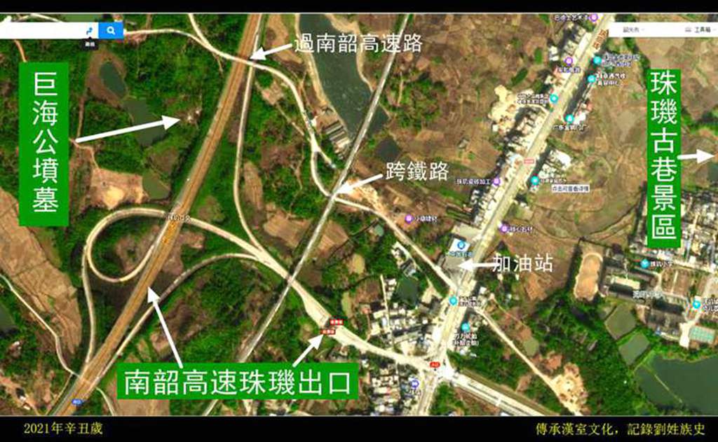 2021年10月7日汉家刘爱民在当地刘运明宗长带领下来到巨海公坟墓,现在的坟墓是2015年重修的,据地图观察,南韶高速在旁边穿插而过,破坏甚为厉害,加上坟墓管理不善,旁边成乱葬岗矣,砂形非常的不好,极待改善。
