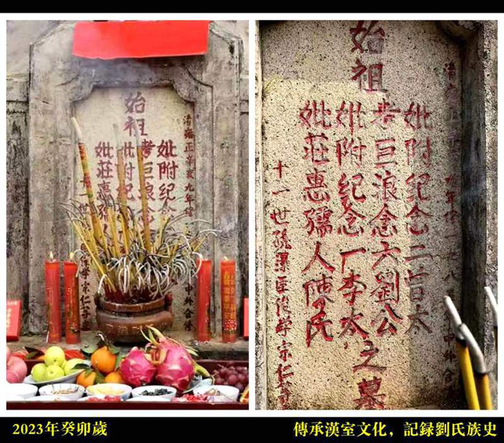 【2023年癸卯岁汉家刘爱民注释】:以上两处坟墓均记载巨浪公与三妣合葬一穴,五华龙村墓未见碑石,观大埔墓碑石,显示巨浪公与陈氏合墓,附纪念原妣李氏和继妣曾氏,坟墓修于清朝雍正九年辛亥岁(1731年),十一世裔孙主修。还有一事实是:大埔宗亲无提供三妣陈氏的相关信息。