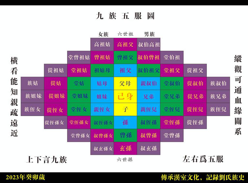 九族中,纵向有父母、祖父母、曾祖父母、高祖父母、己身、子、孙、曾孙、玄孙;横向,有己身、兄弟、堂兄弟、再堂兄弟、三堂兄弟、姊妹、堂姊妹、再堂姊妹、三堂姊妹。围绕着纵横向的九族,形成了九族与五服的家族结构图。往上数,上辈中有叔伯父母、堂伯父母、再堂伯父母、祖伯父母、堂伯祖父母、曾祖伯父母、姑、堂姑、再堂始、祖始、堂祖姑、曾祖姑等。往下数,下辈中有侄妇、堂侄妇、再堂侄妇、侄女、堂侄女、再堂侄女、侄孙妇、堂侄孙姑、侄孙女、堂侄孙女、曾任孙妇、曾侄孙女等。这是一幅完整的九族五服图。