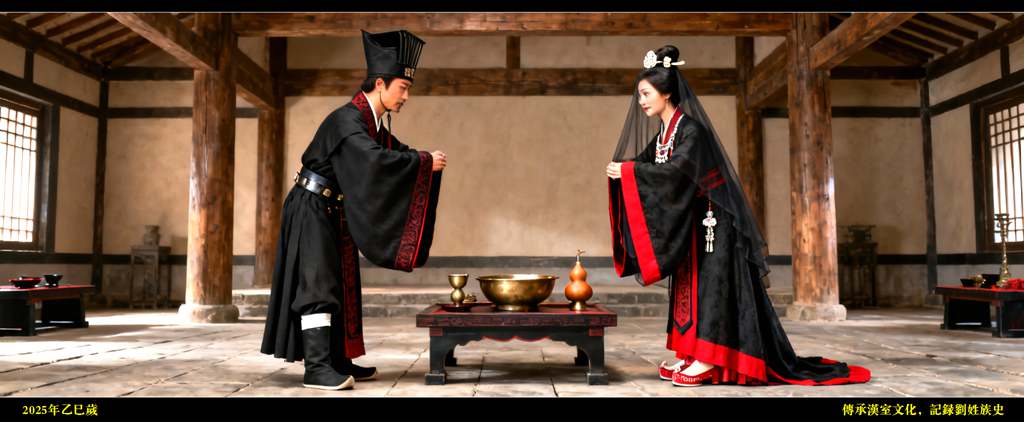 经验老到的喜娘快步引着刘季与吕雉在香案前站定,清了清嗓子,高声唱喏:“一拜天地——”二人并肩转身,对着院门外的天地深深一揖。风儿恰好吹过院门前的红绸,猎猎作响,仿佛天地也感应到这份姻缘,送上了无声的祝福。“二拜高堂——”新人缓缓转向父母,屈膝跪地叩首。刘媪看着眼前身着喜服的儿子儿媳,眼眶一热,悄悄用帕子沾了沾眼角;刘太公也捋着胡子不住点头,满脸欣慰,从袖中取出早备好的红封,放在一旁仆人端着的托盘上。“夫妻对拜——”红巾之下,吕雉微微颔首,动作端庄得体。刘季望着那片鲜红的喜帕,只觉满心的欢喜都要溢出来,依着礼数深深俯身,鼻尖似乎都能嗅到吕雉身上淡淡的脂粉香。礼成!众人齐声欢呼喝彩,喜娘高声宣布:“礼成!送入洞房!”欢声笑语顿时像潮水般淹没了整个院落,喜庆的气氛冲上了云霄!
