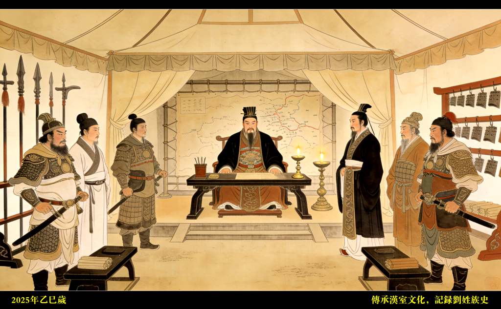 刘邦跟着士卒走进大帐。帐内灯火通明,暖意融融,和外头的寒风刺骨真是天壤之别。项梁端坐主位,身材魁梧,一身黑色铠甲,腰束玉带,目光如电,不怒自威!左右分列着十几员大将,个个虎背熊腰,威风凛凛——左边一人面色刚毅,最特别的是那双炯炯有神的眼睛(双瞳),正是项梁的侄子项羽!他双手按着剑柄,眼神像刀锋一样锐利,上上下下打量着刘邦,带着审视和不屑;其他将领有的抱着膀子站着,有的低头窃窃私语,神色各异。刘邦心里暗暗赞叹项梁军势之盛,不敢有丝毫大意,连忙快步上前,扑通一声双膝跪地,伏地叩拜:“沛县亭长刘邦,拜见项将军!将军高举义旗讨伐暴秦,救万民于水火,天下谁不敬仰!愿将军早日诛灭暴秦,重建大楚,安定天下!”