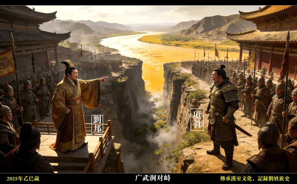 数日后,刘邦与项羽隔着宽阔的广武涧遥遥对峙,一场唇枪舌剑就此展开!项羽勒马立于涧边高坡,衣甲锃亮,长戟在手,对着对岸的刘邦高声咆哮:“刘邦!你我二人相持日久,拖累天下百姓受苦!今日你我便单独决战,一决生死,休要再祸害苍生!”声如洪钟,响彻两岸军营。刘邦立于对岸阵前,神色平静如水,目光淡漠地扫过项羽,并未接话,心中早已盘算停当。