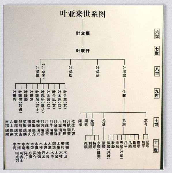 叶亚来先祖比叶挺先祖逢春公要早一百多年到周田定居,其一族后裔发展缓慢。有后裔叶日崇,迁入惠州惠阳周田乡定居,即周田叶氏始祖,再八代就传到叶亚来这里了。